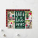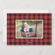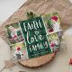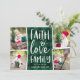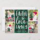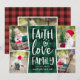 Cartão com fotos de feriado russo e festivo apresenta quatro fotos em um layout de colagem, com "fé, amor, família" em tipografia branca, escrita à mão, em um palco pintado de caçador verde e xadrez de búfalo preto. Personalize com os seus nomes por baixo e adicione uma fotografia adicional à parte de trás num fundo com padrão de xadrez vermelha.