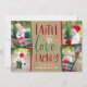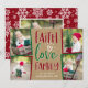 Cartão com fotos de feriado russo e festivo apresenta quatro fotos em um layout de colagem, com "fé, amor, família" em vibrante tipografia vermelha e verde escrita à mão sobre fundo kraft. Personalize com seus nomes embaixo, e adicione uma foto adicional no fundo de um floco de neve vermelho e branco.