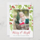 Compartilhe cartões de natal com estes cartões de Natal fotográficos com seu conjunto de fotos favorito em um fundo de frutas e folhas holly, vermelhas e verdes. "Feliz & Brilho" aparece abaixo em letras vermelhas na caligrafia moderna, com seus nomes ou mensagem personalizada na parte inferior.