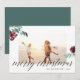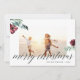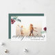 O cartão com fotos de feriado simples e chic apresenta sua foto favorita da família emoldurada por uma grossa borda branca, com "Feliz Natal" encapotado na parte inferior em caracteres modernos de escrita de caligrafia. Flores aquarelas e verde em vermelho festivo e verde completa o design. Personalize com o(s) seu(s) nome(s) e o ano no canto inferior direito. Cartões invertidos a verde-aço sólido.