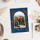 Um fundo azul real e legal e flores vermelhas dão a este cartão de feriado arquitetado uma vibração boêmica moderna com uma sugestão do núcleo da cabana. Adicione a sua foto de orientação do retrato e personalize o texto para personalizar este rico cartão floral de Natal e impressione a sua lista de cartões de férias com o seu estilo de tendência.