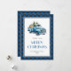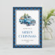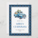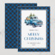 Xadrez de búfalos azuis Cartão de Natal Merry com um caminhão de retro azul. Personalize facilmente este cartão de festas de neve com o seu nome familiar e o ano.