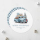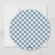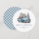 Caminhão azul Cartão de Natal Merry com um padrão de xadrez de gingham azul-claro no fundo.