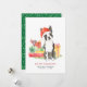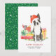 Um cartão de Natal "Boston Terrier" bonito deseja feriados felizes personalizados com seus nomes, nome do cachorro e ano. Pasta verde e branca festiva e fundo de impressão.