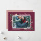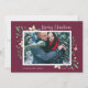 O cartão com fotos elegante e festivo arma sua imagem horizontal ou orientada para a paisagem favorita com uma sutil borda decodificada e folhagem de férias verde e branca a espreitar pelos cantos. "Feliz Natal" aparece no canto superior direito na escrita de caligrafia, com seus nomes e o ano no canto inferior esquerdo.