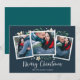Cartões com fotos elegantes e festivos fotografam três de suas fotos quadradas favoritas com uma sutil borda decodificada e folhagem verde e branca de feriado nos cantos. "Feliz Natal" aparece no fundo em uma escrita de caligrafia branca, com seus nomes e o ano abaixo.