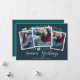 Cartões com fotos elegantes e festivos fotografam três de suas fotos quadradas favoritas com uma sutil borda decodificada e folhagem verde e branca de feriado nos cantos. "Saudações da Época" aparece na parte inferior em um roteiro de caligrafia branca, com seus nomes e o ano abaixo.