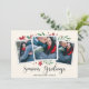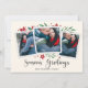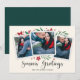 Cartões com fotos elegantes e festivos fotografam três de suas fotos quadradas favoritas com uma sutil borda decodificada e folhagem vermelha e verde de feriado nos cantos, em um fundo de marfim macio. "Saudações da Época" aparece na parte inferior do roteiro de caligrafia negra, com seus nomes e o ano abaixo.