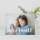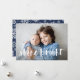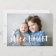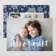 O cartão com fotos Festivo Chanucá apresenta sua foto favorita horizontal ou orientada à paisagem em cheio sangrado, com "brilho brilhante" sobreposto em tipografia de pincel com letra branca. Personalize a frente do cartão com seus nomes e mensagens de feriado curtas, e adicione três fotos adicionais no verso em um layout de colagem em um fundo padrão de floco de neve azul marinho, juntamente com uma mensagem pessoal personalizada. Para um vazio de volta, simplesmente exclua os modelos de fotos e a camada branca matte.