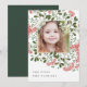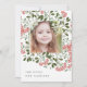O cartão com fotos de feriado elegante apresenta uma foto favorita cercada por uma borda geométrica de uma folhagem botânica verde-luxuosa e minúsculas flores vermelhas de aquarela. Seu cartões de natal personalizado e seu nome ou nomes de família aparecem na parte inferior em caracteres de cinza. Personalize as costas com duas fotos adicionais e uma mensagem pessoal contra um fundo verde caçador.
