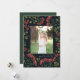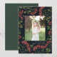 Elegante cartão com fotos de feriado apresenta uma foto favorita cercada por uma borda de uma luxuosa folhagem botânica verde e minúscula flor vermelha de aquarela em um rico fundo de marinho. Seu cartões de natal personalizado e seu nome ou nomes de família aparecem abaixo da sua foto em caracteres brancos. Personalize as costas com duas fotos adicionais e uma mensagem pessoal contra um fundo verde caçador.