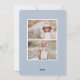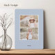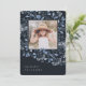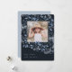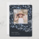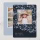 O cartão com fotos Elegante Chanucá apresenta uma foto favorita cercada por uma borda geométrica de folhagem botânica azul pálida e flores minúsculas de aquarela em um fundo rico de marinho. Sua saudação personalizada de Chanucá e seu nome ou nomes de família aparecem embaixo em letras brancas chic. Personalize as costas com duas fotos adicionais e uma mensagem pessoal.