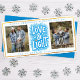 Mande votos sinceros a Chanucá com este moderno cartão com fotos "Amor e Luz", perfeito para celebrar a temporada com familiares e amigos. Apresentando uma tipografia azul ousada com florescimento festivo, borda com brilho dourado e espaço para duas fotos personalizadas, este design combina tradição com encanto contemporâneo. Personalize-o com seu nome de família e ano para torná-lo exclusivamente seu. Uma bela maneira de compartilhar calor, amor e luz durante o Festival das Luzes!