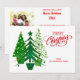 Este cartão de Natal, vermelho, verde e branco, divertido e festivo, tem três folhas metálicas verdes simuladas que olham para árvores de Natal com decorações e estrelas cobertas de ouro. A frase vermelha decorativa na frente diz "Feliz Natal" com um lugar para personalizar com seu nome de família abaixo. No verso, você pode carregar sua própria foto digital na área do modelo de foto e personalizar as caixas de texto para dizer o que quiser. Há também outra árvore verde menor na parte de trás que pode ser removida se você não quiser.