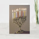 Mande cumprimentos a Chanukah com uma elegante menorah prateada com velas acesas.