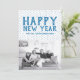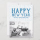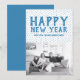 Placa plana de fotos com Feliz ano novo pontilhado com um fundo de bolinhas divertido em azul e branco. Adicione uma foto e uma saudação personalizada para personalizar. Fotografia © Storytree Studios, Stanford, CA