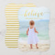 Folha de ouro impressa Acredite no Cartão com fotos de feriado. Elke Clarke © Disponível em www.zazzle.com/monogramgallery. Envie suas cartões de natal de Natal para seus amigos e família usando este belo e simples cartão com fotos de feriado com a palavra "Acredite" escrita em texto dourado sobre a cobertura de texto em um formato de cartão vertical. Substitua a foto de exemplo por sua. Foto impressa de folha de ouro e fundo listrado branco na parte traseira do cartão. Outras cores disponíveis para o padrão alinhado e a cor da palavra acreditam em nossa loja.