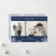 O cartão com fotos elegante e moderno apresenta duas fotos favoritas alinhadas lado a lado, com "Holiday Cheer" no topo, em itálico branco e tipografia de blocos. Personalize com sua saudação personalizada e seu nome na parte inferior, acentuado por quatro ilustrações brancas do floco de neve. Um rico fundo azul marinho adiciona elegância clássica ao seu cartões de natal. A placa se reverte para um padrão de queda de neve em cinzas chic.