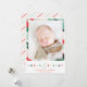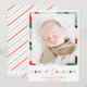Este cartão festivo de Natal de 5 x 7" apresenta uma moderna e paixão borda para armar sua foto. O backer inclui um design de stripe colorido ou você pode adicionar uma mensagem pessoal ou fotos adicionais.