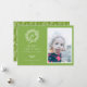 Monograma russo branco de inverno, cartão com fotos de férias em verde festivo. A placa apresenta suporte de padrão correspondente e várias linhas de modelo para a sua saudação personalizada.