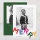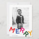 Entra num mundo de charme minimalista e alegria vibrante com esta maravilhosa design de cartão de feriado. Contra um fundo branco limpo, sua foto personalizada brilha na frente, capturando um momento apreciado que encarna o espírito da estação. Letras grandes e coloridas formam a palavra "FELIZ" por baixo da foto. Cada letra é infundida com uma cor clara diferente, criando um display visualmente marcante que irradia com alegria festiva. As letras coloridas dançam alegremente, convidando os destinatários a abraçar o prazer e o entusiasmo da época de férias. Abaixo da foto, em uma fonte sans serif clássica e elegante, seu nome de família e o ano são graciosamente exibidos a preto. Este toque sutil adiciona um toque pessoal e eterno ao design, fazer que este cartão seja um bem-estar.