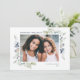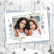 Este elegante e clássico cartão com fotos de férias apresenta uma bela aquarela de folhagem e bagas delicadas. Este design acomoda uma foto horizontal solteiro na frente. A saudação à frente diz "feriados mais felizes" em uma fonte serif clássica, que é completamente editável. A parte traseira do cartão é um padrão desenhado manualmente em azul e branco empoeirados, que pode ser removido se desejado. Você também pode adicionar outra foto à parte traseira e/ou texto adicional.