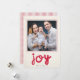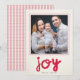 Um cartão de cartões de natal moderno e caprichoso, com a palavra 'JOY' a negrito, vermelho, com um padrão vermelho e branco divertido. Personalize-o com a sua própria fotografia. A maioria dos elementos/tipos de design pode ser movida/alterada/excluída de acordo com sua escolha/preferência. Entre em contato comigo em sika_273@yahoo.com se quiser que o cartão tenha uma cor ou um tamanho diferentes. Obrigado por navegar!