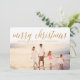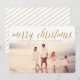 Estes cartões de Natal simples e clássicos apresentam uma fotografia e uma brilha dourada "natal alegre" no roteiro de caligrafia. Personalizado com seu próprio nome familiar. A parte traseira dessas placas possui um design de faixa dourada brilhante.