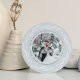O cartão com fotos elegante de feriado recém-casado em forma redonda única apresenta uma foto favorita em um fundo de cinza rico, cercado por uma coroa de folhagem branca sobre um fundo azul-claro de gelo. Personalize com um cartões de natal personalizado (mostrado com "tenha um pequeno Natal casado"), seus nomes e o ano. Perfeito por compartilhar uma foto de casamento no seu primeiro Natal como Sr. & Sra.!