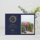 Ouro elegante monograma da pinheira de inverno, cartão com fotos festivo em azul festivo. Recursos de placa que correspondem ao padrão de ouro e várias linhas de modelo para sua saudação personalizada.