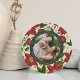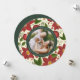 Cartão com fotos elegante em forma redonda única apresenta uma foto favorita em um padrão de fundo de flores vibrantes de poinsettia vermelha, folhagem botânica verde e pequenas flores brancas. Personalize com um cartões de natal personalizado (mostrado com "tenha um pequeno Natal feliz"), seus nomes, e o ano, de branco, em um círculo de caçador verde.