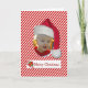 Tornem seus cartões de natal pessoais este ano com este divertido cartão de saudação de fotos de Natal feito em um fundo vermelho e branco de canas candi. Um buraco fotográfico em forma oval, no meio, está pronto para sua própria fotografia. Gráficos de um Pai Natal sentado no topo da área fotográfica, e uma placa branca no fundo é decorada com uma bengala doce bordada. Texto vermelho, Feliz Natal. Personalize o dentro e o texto saudáveis, na frente, para ler o que quiser. Cartão de excelente com fotografia, diferente do resto.