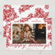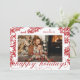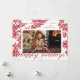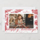 Este elegante cartão com fotos de feriado apresenta uma borda desenhada à mão com bagas vermelhas e folhagem de inverno e um roteiro florescente saudando a leitura de "feriados felizes", destacando um solteiro personalizável para um sentimento clássico de feriado tradicional. O verso adiciona um interesse único com um padrão correspondente de morango vermelho e folhagem.