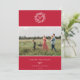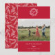 Monograma russo branco da coroa de inverno, cartão com fotos festivo vermelho. A placa tem suporte de padrão correspondente e várias linhas de modelo para a sua saudação personalizada.
