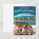Este cartão bonito apresenta três corgis fotorealistas sentados em uma cadeira de praia de madeira sob um guarda-chuva azul. O texto diz "De todos nós... FELIZ ANIVERSÁRIO". Perfeito para amantes de cães ou para quem quer enviar desejos de aniversário de um grupo.