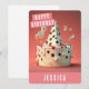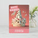 Um cartão de aniversário fofo com um bolo de aniversário temido dalmaciano na frente com "Feliz Aniversário" em uma fonte branca e boné em negrito. Personalize a frente adicionando seus nomes. O dentro da placa apresenta espaço para a sua mensagem escrita ou manuscrita.