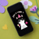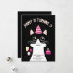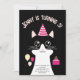 Um cartão de convite de aniversário fofo que apresenta uma ilustração com a cabeça de um gato preto e branco sobre fundo preto, com um chapéu de festa rosa, bailes e um bolo de aniversário. O texto no cartão é personalizável.