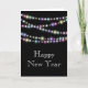 Cordões de luzes coloridas piscando adornam este cartão de Ano Novo, que é fácil de personalizar.