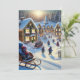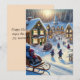 Um cartão de férias que retrata uma encantadora vila nevada onde crianças andam alegremente de trenó, abraçando o espírito de aventura e maravilha.