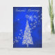 Aqui está um elegante cartão de Natal em azul vívido e prata que apresenta uma bonito espiral cortada padrão de Férias. Atrás da árvore padronizada há um spray de estrelas de prata. Acima da imagem está o texto do roteiro Saudações de Season, também em prata. O dentro da placa tem dois campos de texto para personalizar. Este cartão funciona igualmente como uma saudação pessoal ou como um cartão de feriado corporativo para seus clientes ou clientes.