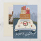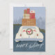 Este cartão de Natal caprichoso e sem foto apresenta uma ilustração desenhada à mão de um carro clássico, decorado com uma coroa de Natal, e encimado por uma pilha de presentes dirigindo nas montanhas nevadas. A frente lê "Boas Festas" em uma bela caligrafia junto com o nome da família personalizável. O verso tem um espaço para incluir uma foto da família e uma mensagem de Natal mais longa.
