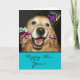 Feliz Ano Novo! Envie seus melhores votos de ano novo com este cartão, que apresenta um adorável cão golden retriever usando um chapéu de festa e segurando uma corneta.