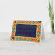 Uma saudação de Eid em letras verdes sobre um fundo azul escuro, rodeada por uma borda ornamentada baseada num padrão islâmico tradicional de estrelas entrelaçadas com luas em cada canto. Este design de cartão de saudação ricamente colorido inclui contornos em tinta guache dourada e é um design original, pintado à mão por Judy Adamson. O interior está em branco para a sua própria mensagem. Veja também a caneca correspondente no mesmo estilo.