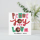 Envie votos sinceros de férias com um charme único e retrô usando este cartão de Natal "Paz, Alegria e Amor". Com a frase festiva "Paz, Alegria e Amor" em uma fonte retrô divertida em rosa, vermelho e verde, este cartão traz um toque de charme nostálgico para seus votos de Natal. A letra "O" em "Alegria" e "Amor" é projetada para conter duas fotos personalizáveis, tornando este cartão uma maneira bonita de compartilhar memórias queridas com amigos e familiares.