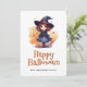 Feliz cartão de Halloween com a ilustração aquática de uma bruxa num chapéu. Personalize facilmente este cartão de Dia das Bruxas fofo para crianças com seu nome e texto de família.