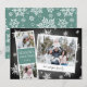 Um cartão com fotos de feriado bonito apresenta uma faixa de fotos com duas fotos e um painel de texto lendo "Saudações da temporada", além de um instantâneo inspirado por câmera instantânea com uma legenda manuscrita. Personalize com seu nome familiar em um fundo de quadro-negro rústico pontilhado com flocos de neve brancos desenhados à mão.