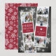 O cartão com fotos de feriado bonito apresenta duas faixas de fotos, cada uma com três fotos e um painel vermelho de amora, para um total de seis fotos. Personalize com o ano e o seu nome ou nomes familiares em caracteres brancos, festivos e brancos, num fundo de quadro rústico, pontilhado com flocos de neve brancos desenhados à mão.