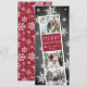 O cartão com fotos de feriado bonito apresenta uma faixa de fotos com três fotos e um painel de texto vermelho de amora. Personalize com o ano e o nome da sua família ou nomes em letras brancas esfestivas, brancas e brancas, sobre um fundo de quadro rústico pontilhado com flocos de neve brancos desenhados à mão.