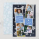O cartão com fotos Chanucá bonito apresenta duas faixas de fotos, cada uma com três fotos e um painel de texto azul, para um total de seis fotos. Personalize com o ano e o seu nome ou nomes familiares em caracteres brancos, festivos e brancos, sobre um fundo azul marinho, pontilhado com flocos de neve brancos desenhados à mão e estrelas brancas de David.
