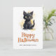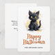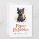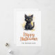 Feliz cartão de Halloween com ilustração aquosa de um gato preto. Personalize facilmente este cartão de Dia das Bruxas fofo para crianças com seu nome e texto de família.